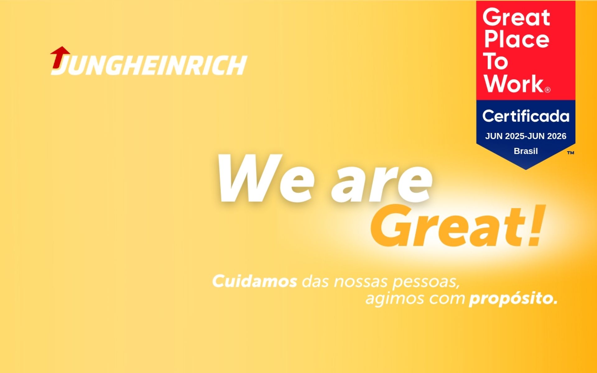 Agradecemos a todos os profissionais que fazem parte da nossa história. Esse selo é resultado do trabalho conjunto, do respeito mútuo e do desejo coletivo de fazer da Jungheinrich um lugar cada vez melhor para se trabalhar.