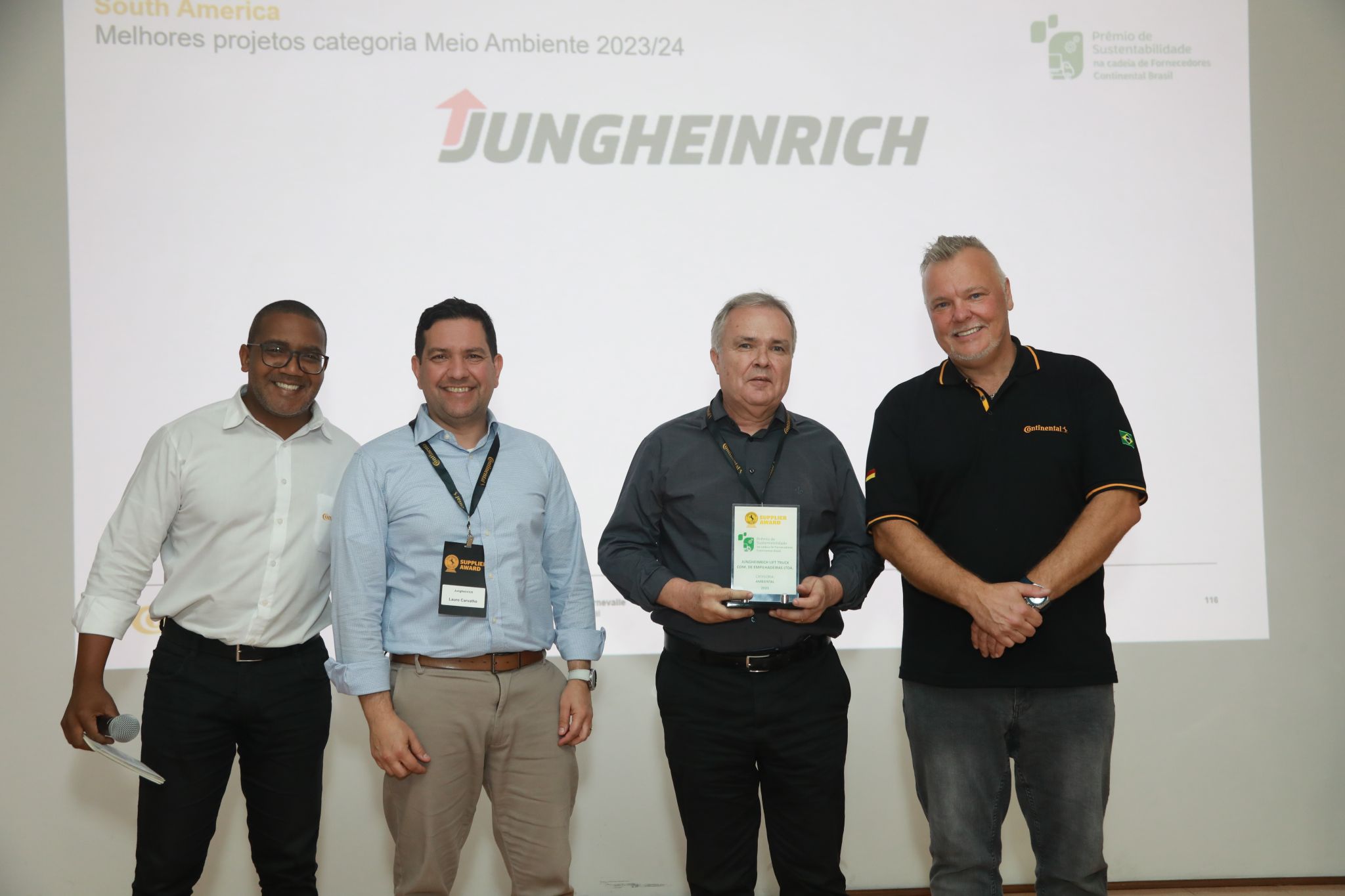 No dia 10 de outubro, a Jungheinrich Brasil teve a honra de ser reconhecida no Prêmio Anual de Fornecedores da Continental, onde, entre 30 projetos inscritos, fomos destacados como um dos oito fornecedores premiados. Recebemos o Prêmio de Sustentabilidade pelo nosso projeto "O Meio Ambiente Ganha em Dobro", que evidencia nossa atuação em iniciativas de engajamento ambiental e social no Brasil.